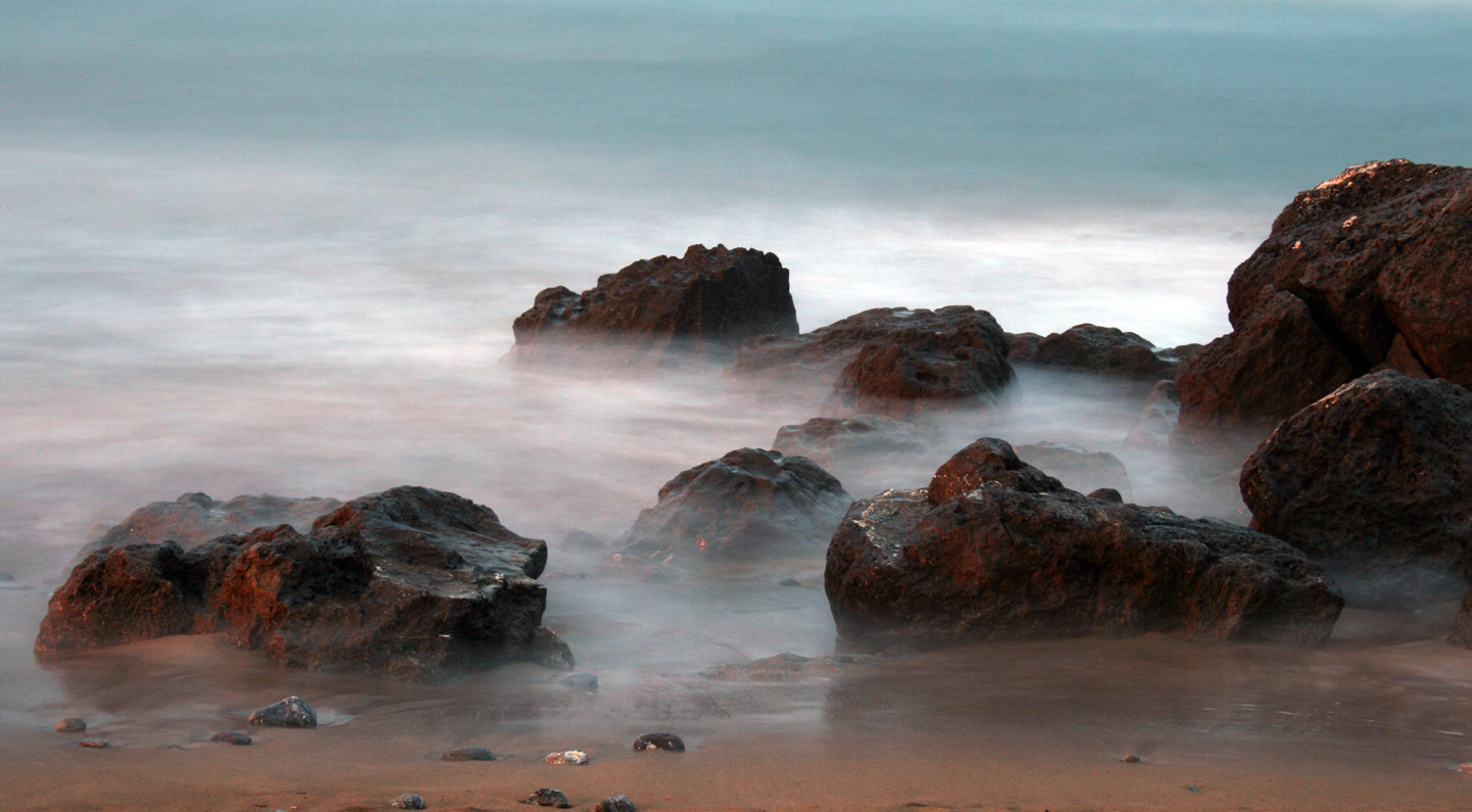 Esta segunda imagen es el mismo sistema aunque es por la noche. En esta aprendí que cuanto más tiempo está expuesto el sensor más luz captura, como es lógico pero también empieza a aparecer luz no deseada como la luz de las farolas que, en esta foto, me anaranjó un poco las rocas. Puede no quedar mal pero no era lo que buscaba, quería un efecto seda para blanco y negro.